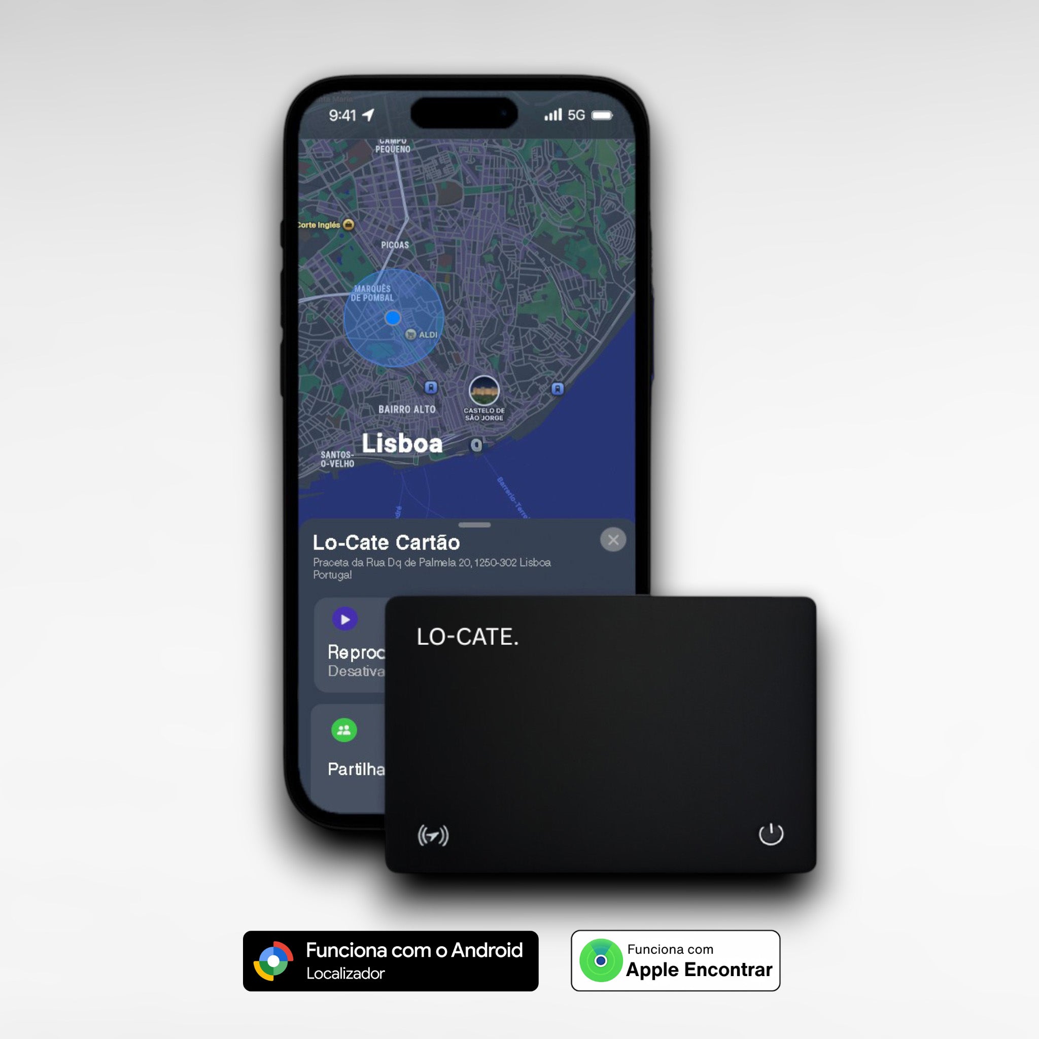 Para localizar o seu Lo-Cate Cartão, utilize a app Apple Find My ou a app Find Hub no Android.