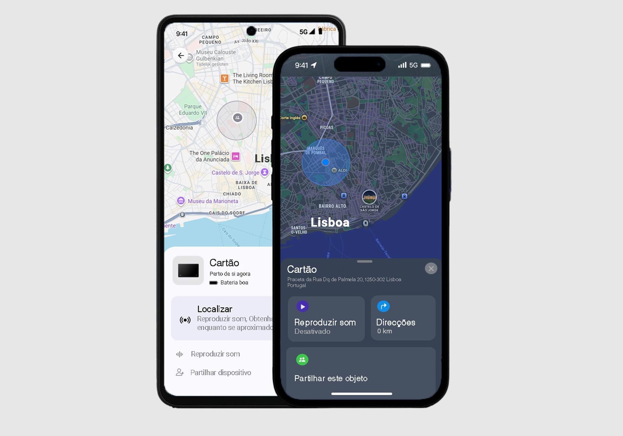 No iPhone, liga-se à app Encontrar (Find My) da Apple e utiliza a rede global de dispositivos Apple para mostrar a localização.
